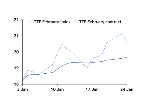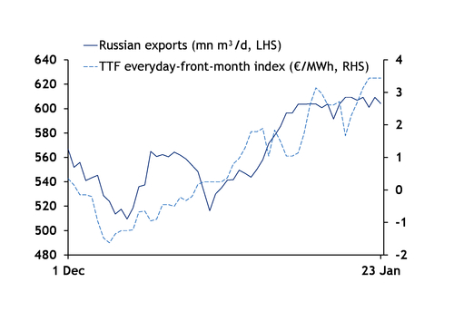 TTF prompt prices have climbed well above the front-month index, which settled at €17.46/MWh for January. Russian deliveries increased in the past when European prompt markets rose above the front-month index's settlement.