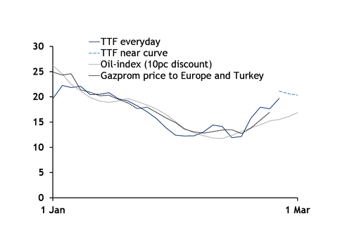 Russian exports to Europe have increased, particularly this winter. Hub prices above oil-indexed import costs have encouraged strong nominations by companies with flexible crude-linked contracts. And Gazprom raised sales through its European trading subsidiaries last year.