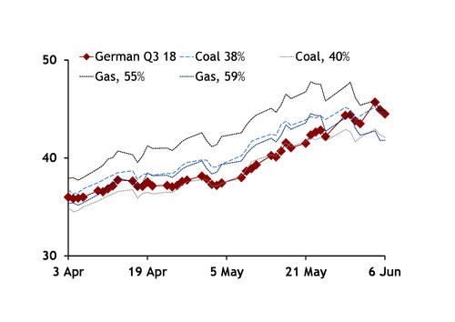 German third-quarter 2018 base-load prices have been rising in recent weeks as the market is expecting the merit order to be pushed deeper into coal and gas burning territory.
