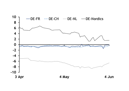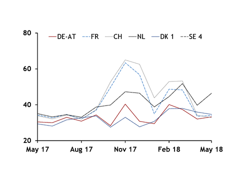 Nordic hydro stocks at the start of week 22 continued to hold a wide year-on-year surplus. But the weekly increase in Swedish reservoir levels in particular has slowed, with stocks there holding a 60pc surplus to levels a year earlier as of last week, compared with a 106pc surplus in mid-May. Germany shares an interconnector with the south Swedish SE 4 prices zone. In May, the average German-Austrian day-ahead settled at a €2.21/MWh discount over the SE 4 prices zone, compared with €0.30/MWh premium in the same month last year. And average German-Austrian prices in May settled €1.41/MWh below the DK 1 price zone with west Denmark, compared with a €0.39/MWh premium in May 2017.