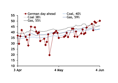 But falling demand for German exports and new record renewable energy generation, which rose largely as output from hydro power plants rose to a ten-year high, failed to weigh on average German-Austrian day-ahead auction settlements in May. The German-Austrian day-ahead settled at an average of €33.54/MWh for base load delivery on the Paris-based Epex Spot exchange, compared with €30.46/MWh in the same month a year earlier. The weighted average of hourly products in the German-Austrian intra-day market stood at €34.73/MWh, which was an increase from €31.83/MWh from May 2017. Rising costs for power sector coal and gas burn offered support to German-Austrian day-ahead and intra-day prices last month as individual hourly settlements had to step up to price levels that were sufficiently high to bring lower efficiency coal and, on less windy and sunny days, efficient gas-fired units on line, at higher start-up costs compared with these plants running base- or medium load. Average marginal costs for 46pc-efficient coal plants stood at €35.08/MWh in May, rising by around €10.50/MWh year on year, while the costs of operating a 59pc-efficient gas-fired plant rose to €41.80/MWh from €28.75/MWh a year earlier, based on Argus assessments for API 2 coal and EU ETS prompt and for NCG day-ahead prices.