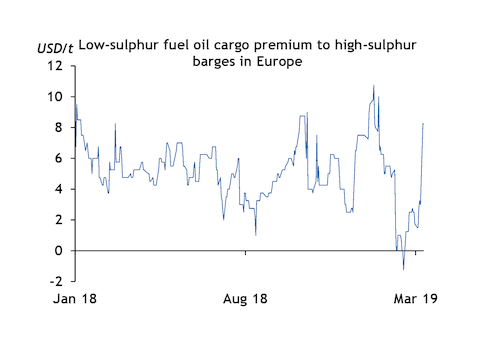 Low sulphur fuel oil (LSFO) cargo prices reached a $8.25/t premium to high-sulphur fuel oil (HSFO) barges this week in Rotterdam, its widest since January, following a sharp increase in demand. The high-low premium has averaged just $4-5/bl since the start of 2018.