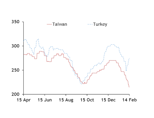 The Turkish import price this month has risen by 2.7pc, or $7.20/t, to $274.70/t. The Taiwanese import price has fallen by 10.4pc, or $25/t, to a three-year low of $215/t.
