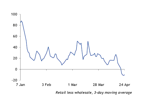 Retail VLSFO typically sells at a premium to wholesale, a pattern that held in March — when VLSFO retail was at a $30.35/t average premium to wholesale, and from 1-16 April when it was at a $17.58/t premium, according to Argus assessments.
