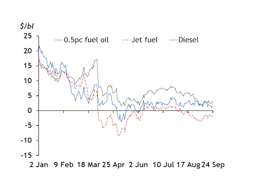 European VLSFO prices have averaged a $4.95/bl premium to European jet fuel in September, the highest since April, and are at a premium to diesel for the first time since 9 September. While this appears to suggest that blending jet into marine fuels is viable, it is not yet a widespread practice in Europe because of concerns that it could lower the latter's flash point.