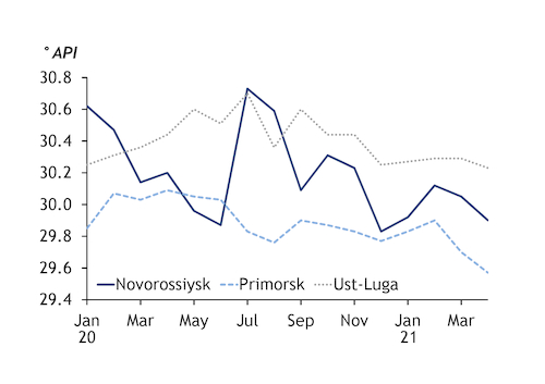 There are also growing concerns about seaborne Urals' quality — particularly increasing density. Data from pipeline operator Transneft indicate that April-loading Urals was heavier than a year earlier at the Baltic ports of Primorsk and Ust-Luga, and at Novorossiysk on the Black Sea — sliding by 1.7pc to 29.57°API, by 0.7pc to 30.23°API and by nearly 1pc to 29.90°API, respectively. The decline comes at a time of growing demand for low-sulphur supplies, participants say.