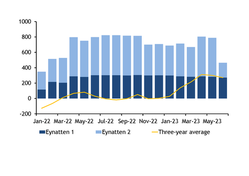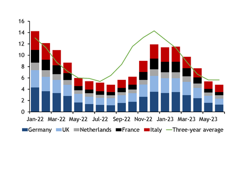 UK sendout was the slowest for any month since September 2021 as domestic production and imports from Norway were ample to cover much reduced demand with high temperatures for much of the month. And Belgian sendout was the slowest since September. The country's demand also held below the three-year average during the month, while flows to Germany collapsed and fell to their lowest for any month since January 2022 (see pipeline graph).