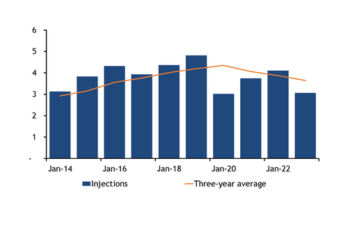 Injections were at their lowest for any June since 2020 at 3 TWh/d, below the three-year average of 3.7 TWh/d (see injection graph). The slow stockbuild is likely to continue in the coming months with inventories already well above historical averages. EU and UK stocks were at 890TWh or 79pc of capacity on Sunday, above the three-year average of 706TWh for the date.