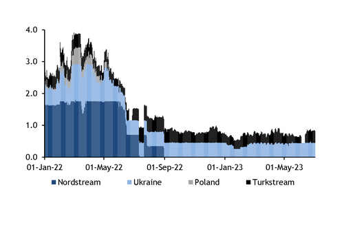 But sendout could nevertheless continue to be boosted from a year earlier by weaker Russian pipeline receipts. European imports from Russia were just 722 GWh/d in June, down from 1.8 TWh/d for the month a year earlier (see Russian graph).