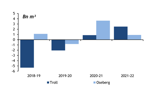 Troll production in the 2020-21 and 2021-22 gas years exceeded the quota, by 862mn m³ and 2.5bn m³, respectively (see graph).