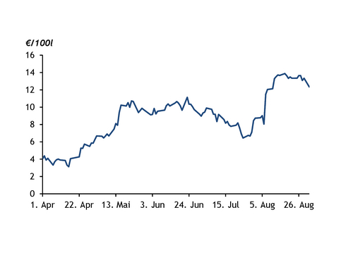 Denn im Mai stieg die Differenz von HVO zu Diesel erstmals deutlich an. Grund war Niedrigwasser auf dem Rhein, wodurch Binnenschiffe nicht mehr voll beladen fahren konnten. In dieser Phase priorisierten Anbieter Dieseltransporte — HVO war deshalb nur eingeschränkt verfügbar (siehe Grafik). Und im August wuchs der HVO-Aufschlag auf Diesel im Großhandel weiter an: Hintergrund sind geplante Wartungsarbeiten bei Neste, deren HVO-Produktionsstätten in Rotterdam und Singapur jeweils für sechs Wochen vom Netz gehen sollen. Die bevorstehenden Ausfälle führen laut Händlern bereits jetzt zu erhöhter Nachfrage aufgrund von Bevorratungen, was zu dem Preisanstieg beiträgt. Auch die generell gestiegene HVO-Nachfrage in Westeuropa infolge der geplanten Umsetzung der RED III in den Mitgliedsstaaten der EU führt laut Händlern zu höheren Preisen, da viele verpflichtete Unternehmen HVO als zentrale Erfüllungsoption sehen.
