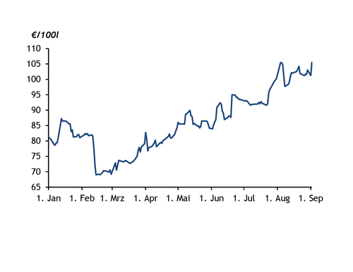 Theoretisch könnten Händler also HVO in Reinform einfärben und mit dem gleichen Energiesteuersatz wie Heizöl verkaufen. In der Praxis passiert dies jedoch nicht — auch, weil es im Vergleich zu fossilem Heizöl zu teuer wäre. Vor Steuern beläuft sich der Aufpreis von HVO im Handelszentrum Amsterdam-Rotterdam-Antwerpen (ARA) gegenüber Heizöl auf etwa 100 €/100l. Diese Spanne wird in Deutschland um 14,70 €/100l geschmälert, da die CO2-Abgabe für Inverkehrbringer fossiler Brennstoffe nicht auf HVO erhoben wird. Mit dem perspektivischen Anstieg der CO2-Abgabe könnten sich die Preisniveaus in Zukunft entsprechend weiter angleichen.