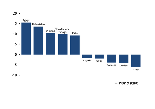 Top five most, least exposed countries, World Bank CBAM Trade Exposure Index pc