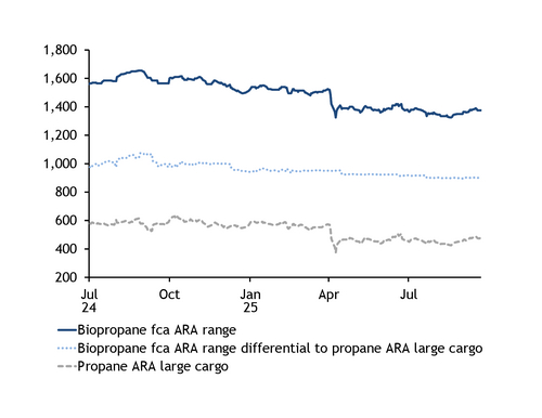 Used cooking oil-based biopropane prices averaged $1,361.25/t fca ARA in the third quarter, down from $1,393.25/t in the second quarter and $1,519.50/t in the first, and from $1,599/t a year earlier. This was partly owing to lower propane prices, with large cargo cif ARA below $500/t for most of June-August. Northwest Europe has absorbed increased flows of US LPG even during periods of lacklustre demand, while Chinese demand eased and US-China tariff uncertainty persisted.