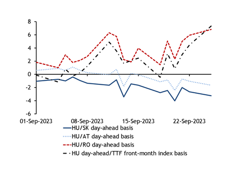 Argus' Romanian day-ahead price on average closed €6.36/MWh below its Austrian counterpart on 19-25 September, incentivising Hungarian buyers to prioritise imports from Romania over Austria (see basis graph). Romanian prices have frequently diverged from surrounding markets in recent months, as the country produces significantly more gas than it consumes in the summer months and weak domestic demand this year meant storages filled quickly.