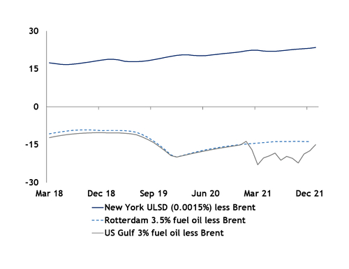 Nymex data shows US Gulf 3pc sulphur residual fuel oil and Rotterdam 3.5pc sulphur residual fuel oil futures selling at $9.12-12.94/bl discount to Brent until August 2019. During the period September 2019 through December 2020, the US Gulf and Rotterdam fuel oil futures discount to crude widens to $13.55-19.90/bl.