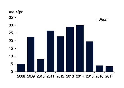 Global LNG trade exceeded expectations last year, rising by 29mn t to 293mn t. New US and Australian capacity came on stream as expected. But production growth was around 30pc higher than forecast at the start of 2017, as projects in Angola and Nigeria performed better than in recent years. The market "comfortably absorbed" the increase in supply, owing to higher consumption in north Asia and southern Europe, Shell says.