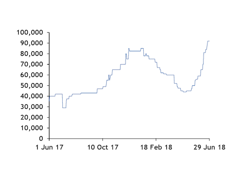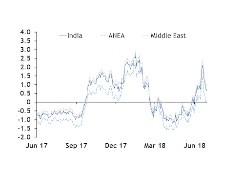 The average profit margin for a front-month reload from the Netherlands' gate terminal to India, based on Indian delivered prices and the TTF front-month market averaged 60¢/mn Btu in June. The equivalent near-curve margin a year earlier had been minus 76¢/mn Btu. India imported a significant portion of July northwest European reloads. The profit margin assumes spot shipping costs and terminal fees.