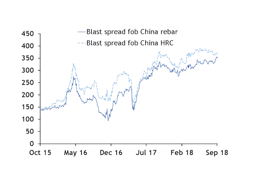 There is a link between China's strong steel fundamentals and wider trade discord — Beijing will have to ease back on the pace of planned economic reforms given the potential for a trade war-led economic slowdown, so it has reduced credit restraints, aiding a buoyant real estate market. This has provided a spur to Shanghai Futures Exchange rebar as well as spot pricing.