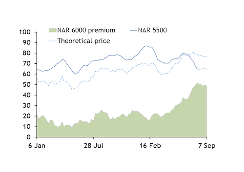 The price premium for fob Newcastle NAR 6,000kcal/kg to NAR 5,500 coal from the same key port has been above the long-term average for the past 18 months and has widened to new records over the past six months. Fob Newcastle 6,000 kcal/kg coal was at $113.60/t on 7 September, over $48/t higher on a non-heat adjusted basis than fob Newcastle NAR 5,500 high-ash coal at $64.78/t, partly because high-ash coal has been hit by softer Chinese demand over the past two months and because higher-premium coal is in tighter supply.