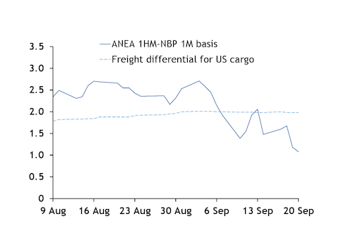 The NBP's front-month contract was close to providing a higher netback to the US Gulf Coast than the Argus northeast Asia (ANEA) front half-month market at the end of August. And the NBP October contract was more competitive than the northeast Asia second-half October market for US supply when accounting for the difference in spot freight costs.