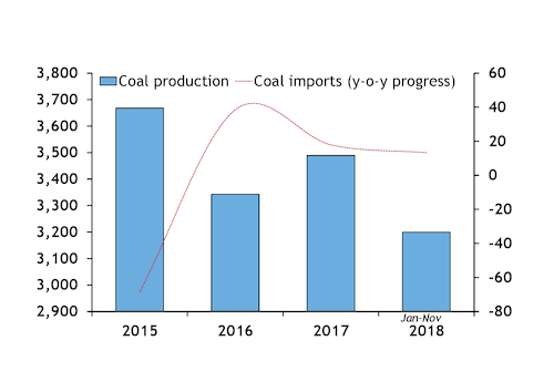 China's coal production increased on the year in most months in 2018, except for a fall of 2pc in July. Output reached 3.21bn t in January-November, up by 5.4pc from the same period a year earlier (see chart).