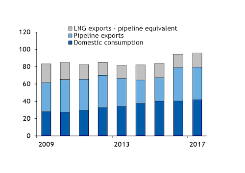 Aggregate commercial production rose to 96.6bn m³ in 2017, from 95bn m³ a year earlier. But most of the additional output was absorbed by the domestic market, with only a minimal year-on-year increase in exports.