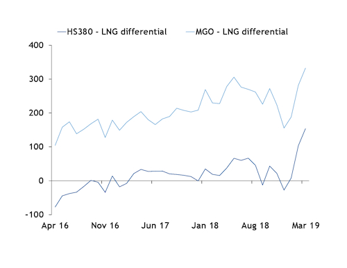 In the shorter term, shipowners appear content to ride out high prices for HS380 fuel oil by using scrubbers to clean non-compliant fuel to the International Maritime Organization's (IMO) 0.5pc sulphur standard, expecting that the fuel price will fall.
