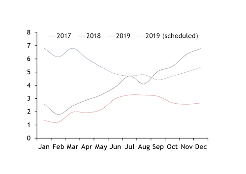 But fossil fuels could recover some ground in the second half of the year, as planned maintenance across the country's nuclear fleet is likely to leave a shortfall in output. The latest maintenance schedules indicate that Japanese nuclear availability will be down by around 656MW in the second half of the year, reducing output by up to 2.9TWh over July-December compared with the same period of 2018.