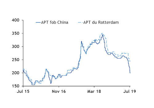 European APT prices have fallen by 29.4pc since July last year, but Chinese prices have posted sharper falls, sliding by 41.1pc.