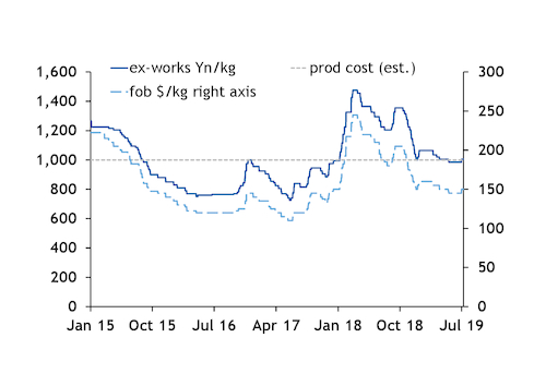 The spike in enquiries in the summer may have brought more material to the spot market, delaying production cuts, and contributed to the collapse in prices in October-December, during which ex-works prices fell to Yn1,000/t from Yn1,355/kg in October and export prices fell to $150/kg fob from $205/kg fob.