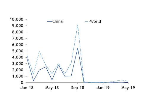 In January-September 2018, the US imported 19t of gallium from China (see chart), which is more than in the previous three years combined. But US imports from China have fallen to just 76kg so far this year and tariffs were increased further to 25pc on 24 May.