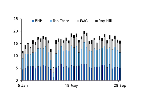 Shipments by Rio Tinto, BHP, Fortescue and Roy Hill to China were 14.5mn dwt in the week to 28 September, up from 12.52mn dwt in the week ended 21 September.