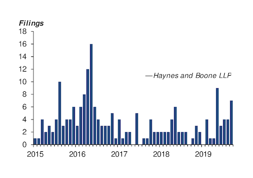 A total of 33 US firms filed for Chapter 11 protection in January-September, with combined debt of nearly $13bn, figures from law firm Haynes and Boone show (see graph). At least three more producers have filed for bankruptcy since then, including EP Energy, an Eagle Ford-focused firm. EP has net debts of $4.6bn, making it the largest upstream bankruptcy filing since SandRidge Energy in 2016.