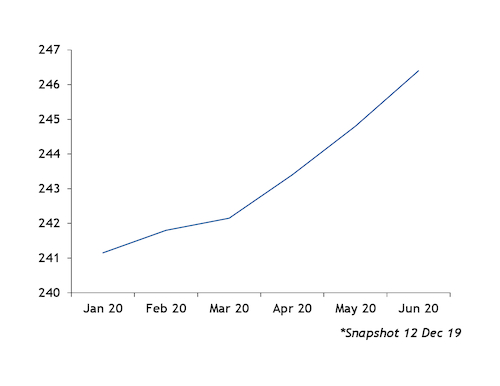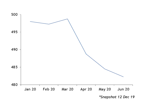 With 3pc sulphur fuel oil swaps trading in contango and 0.5pc sulphur fuel oil swaps trading in backwardation, the forward curve differential between the low-high sulphur residual fuel oil narrows to $236/t in June 2020 from $257/t in January 2020. The spot, physical 0.5-3.5pc sulphur fuel oil differential averaged $276/t from 2-10 December.