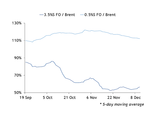 Market sentiments about future demand are also reflected in the physical spot market for December. Despite dwindling spot demand for bunkering HSFO, US Gulf 3.5pc sulphur fuel oil as a share of the price of Brent fluctuated at 52-57pc since mid-November, after dropping from 85pc in October. By contrast, despite higher physical bunkering demand for LSFO, US Gulf 0.5pc sulphur fuel oil as a share of the price of Brent has fluctuated at 112-119pc of the price of Brent, after climbing up to 122pc at the beginning of November.