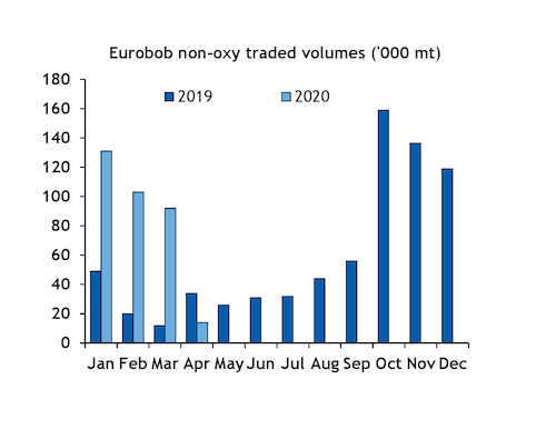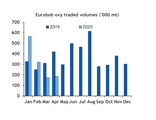 Oxy barge trading liquidity rose to 172,000t in April from 82,000t in March — when volumes dropped to their lowest on record, coinciding with the start of travel restrictions imposed in Europe to limit the spread of the Covid-19 pandemic.