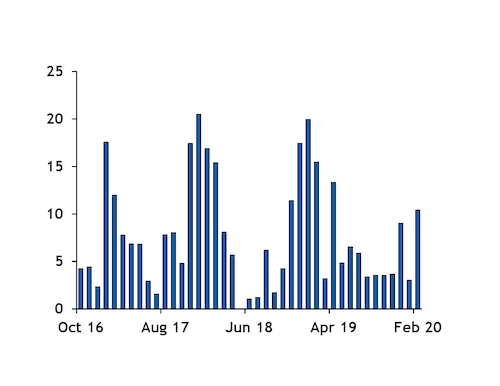 And production from Aasta Hansteen, which was commissioned in December 2018 and reached its plateau around February 2019, was up in January-February from a year earlier. Equinor operates the field with a 51pc stake.