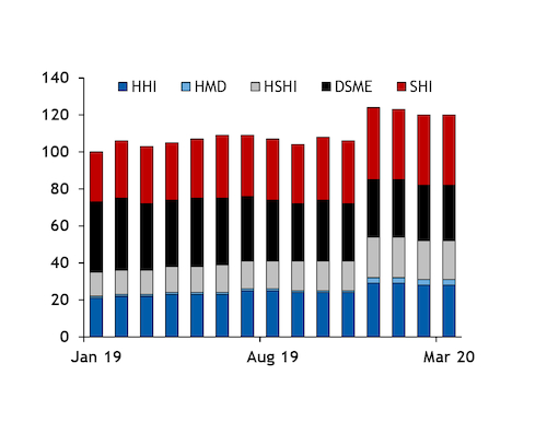 That said, the South Korean builders' combined backlogs could be buoyed by delayed deliveries. Bermuda-based owner Gaslog suggested this month that some newbuilds on the global orderbook that had initially been due for delivery this year could be delayed to 2021, as Covid-19 weighed on yard capacities. Around 40 had been scheduled for delivery later this year, the owner said, adding that it expects delayed delivery to be more prevalent for vessels not yet tied to term charter agreements.