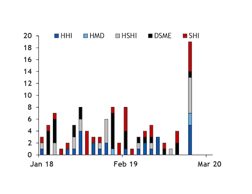 KSOE retained the largest unfulfilled orderbook of the three firms, with 52 vessels still to be delivered by the end of March, down from 54 in December, but up from 36 a year earlier. The firm incorporates three entities — Hyundai Heavy Industries (HHI), Hyundai Mipo Dockyard (HMD), and Hyundai Samho Heavy Industries (HSHI). HHI and HSHI delivered a single vessel each in February, while HMD — which has typically received orders for small-scale vessels in recent years — had an unchanged backlog.