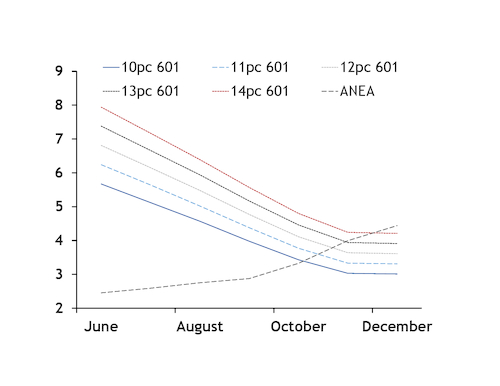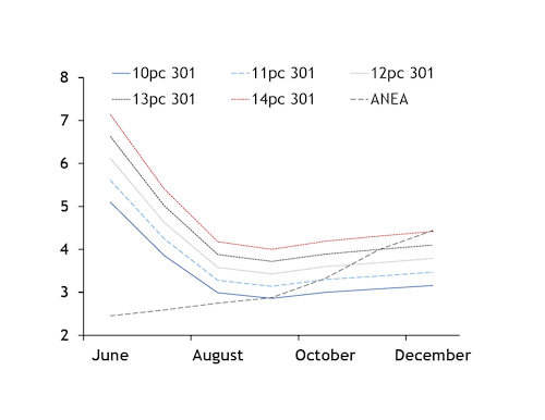 The ANEA October price remained at a premium to the 11pc slope 301 curve yesterday, but at a discount to the 12pc curve. And the ANEA November price held parity with the 13pc 301 curve.