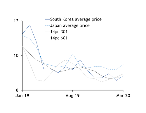 Japan and South Korea average monthly prices $/mn Btu