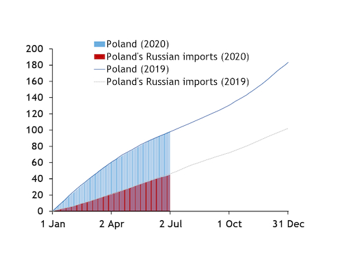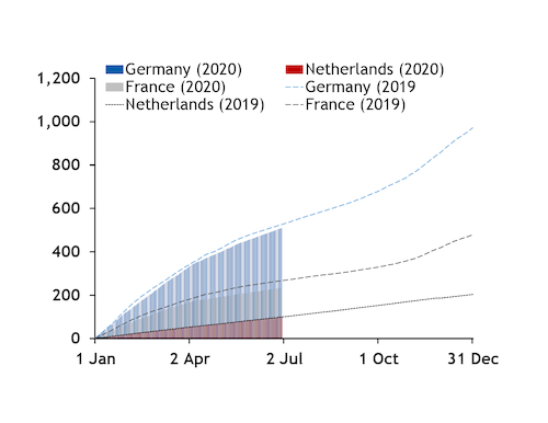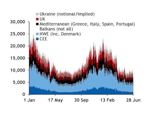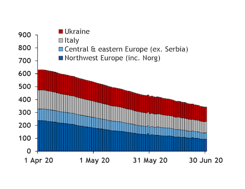 And summer consumption could be muted, given Europe-wide lockdowns and slow economic recovery from Covid-19. Aggregate consumption on 1 April-28 June in these same 12 countries was 546.9TWh, down from 611.4TWh a year earlier (see demand graphs).