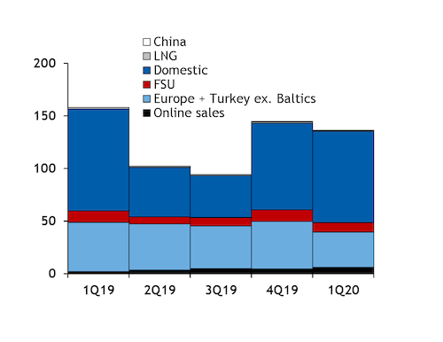 But online sales' share of total revenue could fall over the rest of the year. Weak demand owing to the Covid-19 pandemic and high start-of-summer stocks have pressured European hub prices from the front of the curves, while also reducing the scope for quick sales to these markets this summer.