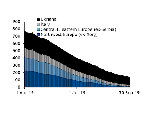 Combined storage inventories in 12 of Gazprom's 15 largest markets — based on sales last summer — of 523.1TWh on 1 April were 423.3TWh below capacity. This would limit the scope for injections — and sales by the Russian firm — compared with last summer, even assuming sites are fully replenished by the start of the winter (see space-to-fill graphs). Injections totalled 542.3TWh last summer, which was already the weakest in recent years.