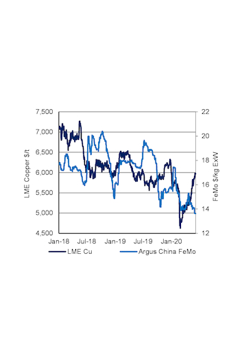 Ex-works China ferro-molybdenum prices shed 24.4pc year on year to reach $13.43/kg on 26 June. Notably, its correlation with copper prices has tightened during the pandemic as shocks to both metals' demand fundamentals happened quickly and in parallel (see chart).