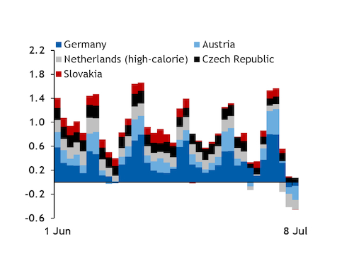 The switch to withdrawals has significantly slowed or reversed the stockbuild in a number of countries. Combined German, Austrian, Czech, Slovak, and high-calorie Dutch sites switched to withdrawals of 101 GWh/d on 6-8 July from injections of 904 GWh/d earlier in the month (see stock movements graph).