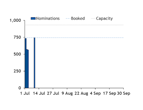 Scheduled works at Mallnow halted flows at the German-Polish border point on 6-10 July. Nominations were 624 GWh/d on 1-5 July — well below capacity of 931.5 GWh/d — but rose again to 744.5 GWh for 11 July (see Mallnow graph).