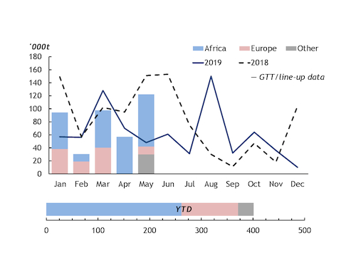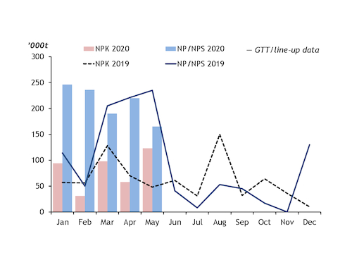 Exports of NP/NPS rose by 28pc in January-May. Djibouti was the top destination, representing shipments under the Ethiopian Agricultural Business Corporation's (EABC) annual NPS purchase tender award. Aggregate exports to Djibouti and Ethiopia rose by 5pc year on year, as the volume of Ethiopia's 2019 tender award — for first-half 2020 delivery — was higher than the 2018 award.