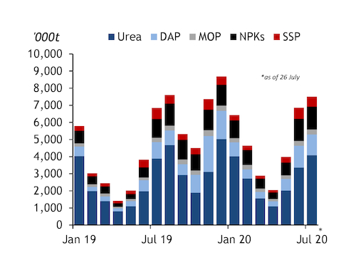 Total DAP, SSP and NPK sales to farmers in India have accelerated this year, outstripping the 2019 kharif season with a rise of 56pc to 8.9mn t between April to 26 July, Argus calculates.
